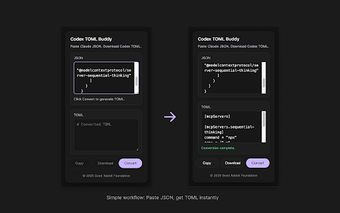 Codex TOML Buddy เป็นส่วนขยายของ Chrome ที่ออกแบบมาเพื่อทำให้การแปลงไฟล์การกำหนดค่า JSON เป็นรูปแบบ TOML ง่ายขึ้น โดยเฉพาะสำหรับผู้ใช้แพลตฟอร์ม Codex ของ OpenAI เครื่องมือนี้ช่วยให้ผู้ใช้สามารถวางข้อมูล JSON ของตนได้อย่างง่ายดาย คลิกปุ่ม และรับผลลัพธ์ TOML ที่ตรงกันทันที มันทำงานภายในเบราว์เซอร์โดยไม่ต้องใช้เครื่องมือภายนอก ทำให้การทำงานรวดเร็วและมีประสิทธิภาพ โดยเฉพาะอย่างยิ่ง มันมีฟีเจอร์ต่างๆ เช่น การตรวจจับข้อผิดพลาดสำหรับ JSON ที่ไม่ถูกต้องและตัวเลือกในการคัดลอก TOML ที่แปลงแล้วไปยังคลิปบอร์ดหรือดาวน์โหลดเป็นไฟล์
